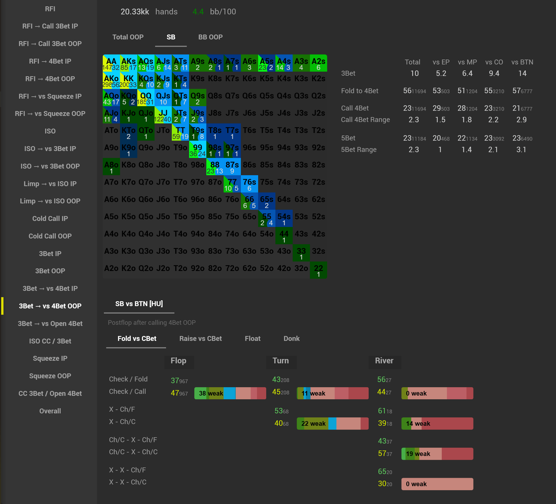All the preflop and postflop lines stats, hand strength and preflop ranges visualization, EV of different bet sizings and hand groups, breakdown by board texture, and more.