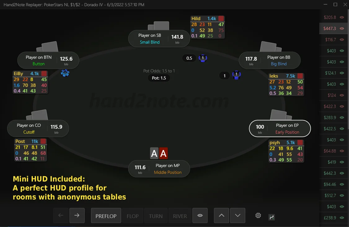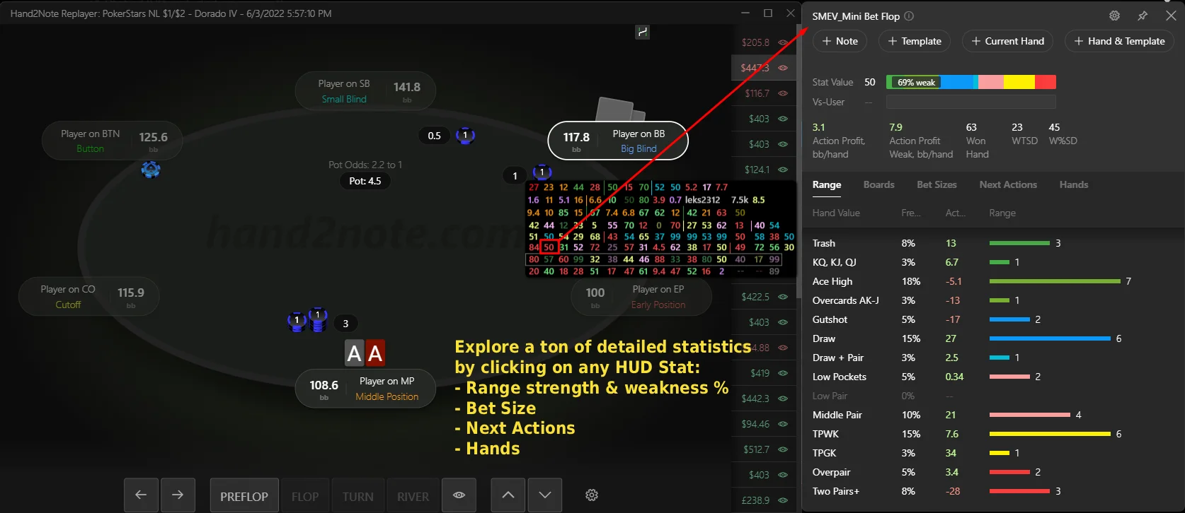 In addition, it has +19 customized Popups with much more detailed information, diagrams and preflop ranges to take the full potential of Hand2Note.