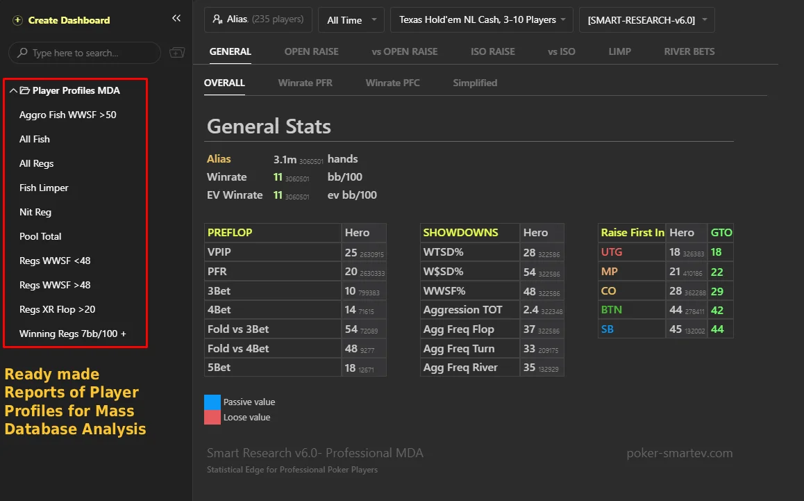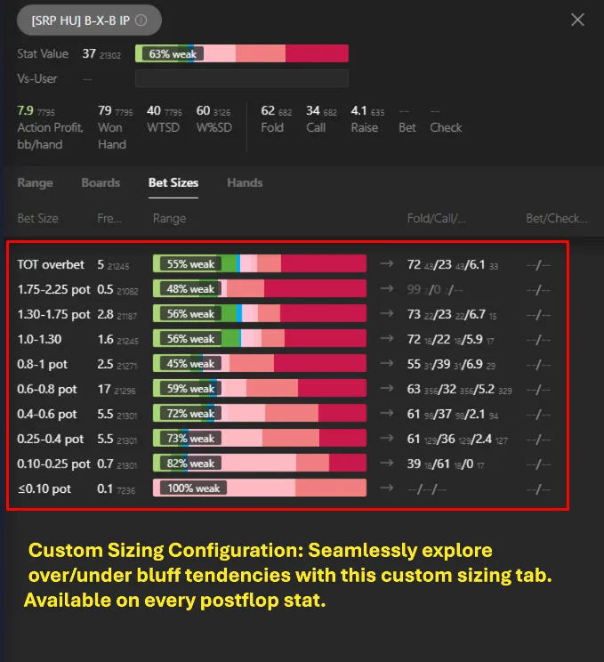 Whether you are a grinder at any stake or a coach, this package will give you the ability to explore any NL Hold'em situation, be it preflop or postflop, and find out where your opponents are unbalanced, which lines are more overbluffed, underbluffed, what sizings are used to bluff, valuebet and adjust our strategy based on real data.